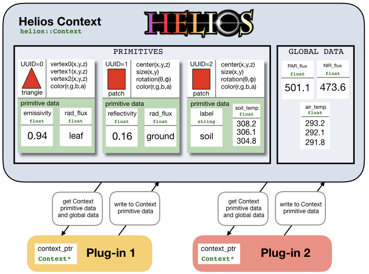 The basic idea behind Helios is that each primitive element is associated with a set of data, and models are written that operate on this data. This geometry and associated data is what couples models. For example, if we are interested in modeling radiation, each primitive may have data associated with radiative properties such as emissivity, reflectivity, etc. The radiation model would then take that data, along with data that defines the primitive geometry (e.g., position, size), and use that to compute a radiative flux for the individual element.