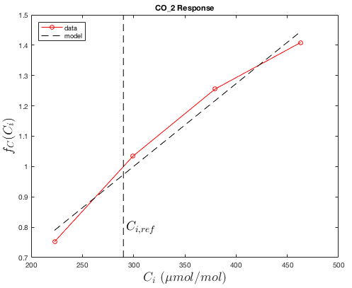 where \(C_i\) is intercellular CO2 concentration ( \(\mu\)mol CO2/mol air).