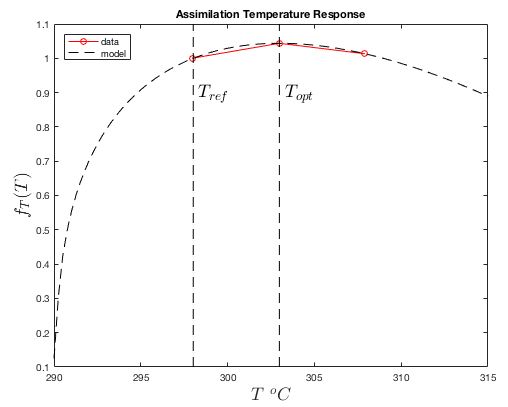 where \(T_{min}\) is the minimum temperature at which assimilation occurs, \(T_{opt}\) is the temperature at which the maximum assimilation rate occurs, \(T_{ref}\) is the reference temperature chosen to define \(A_{ref}\), and \(q\) is a shape parameter.