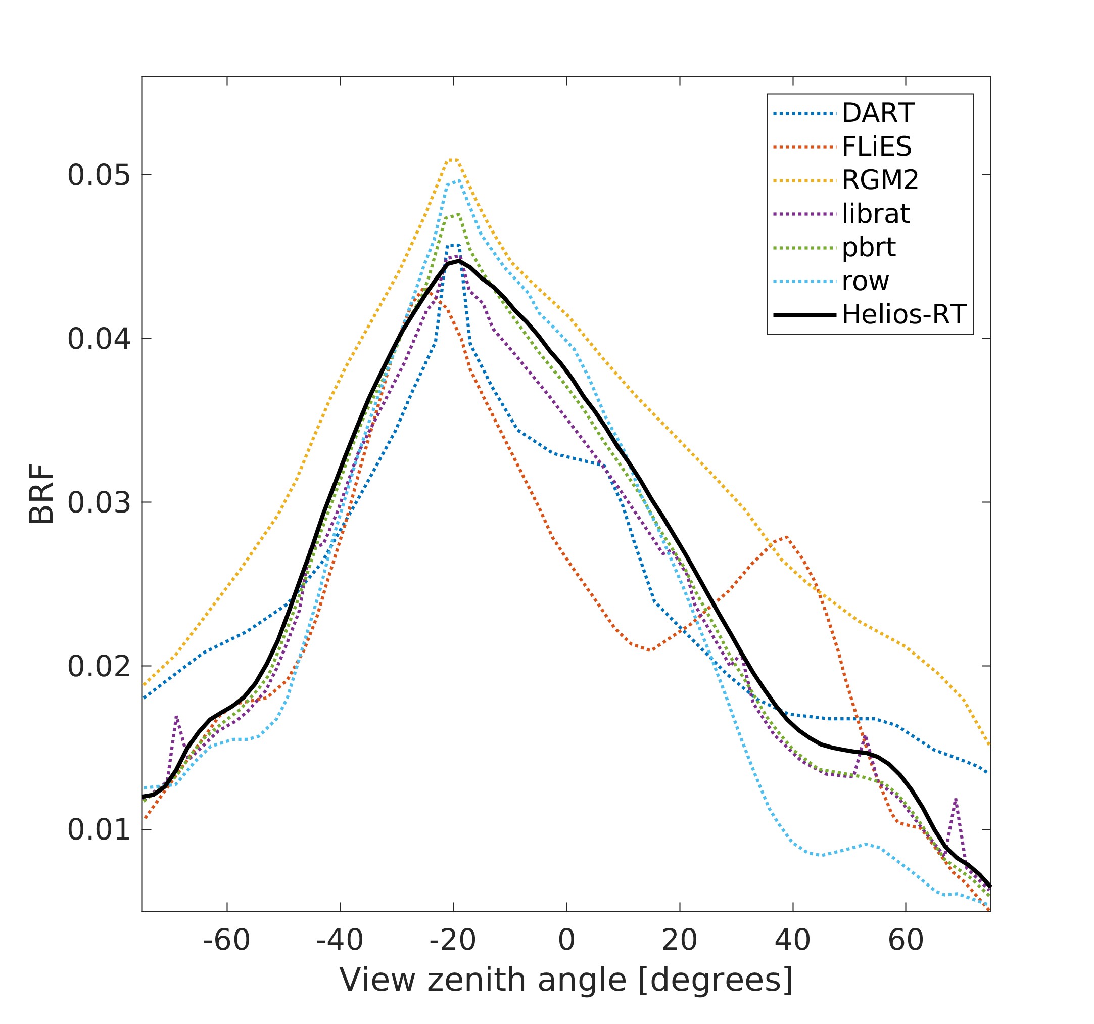 Figure. The BRF (brfpp) curves of the actual scene "Wellington Citrus Orchard" obtained by RAMI IV benchmark models and the present ray-tracing model (Helios-RT).