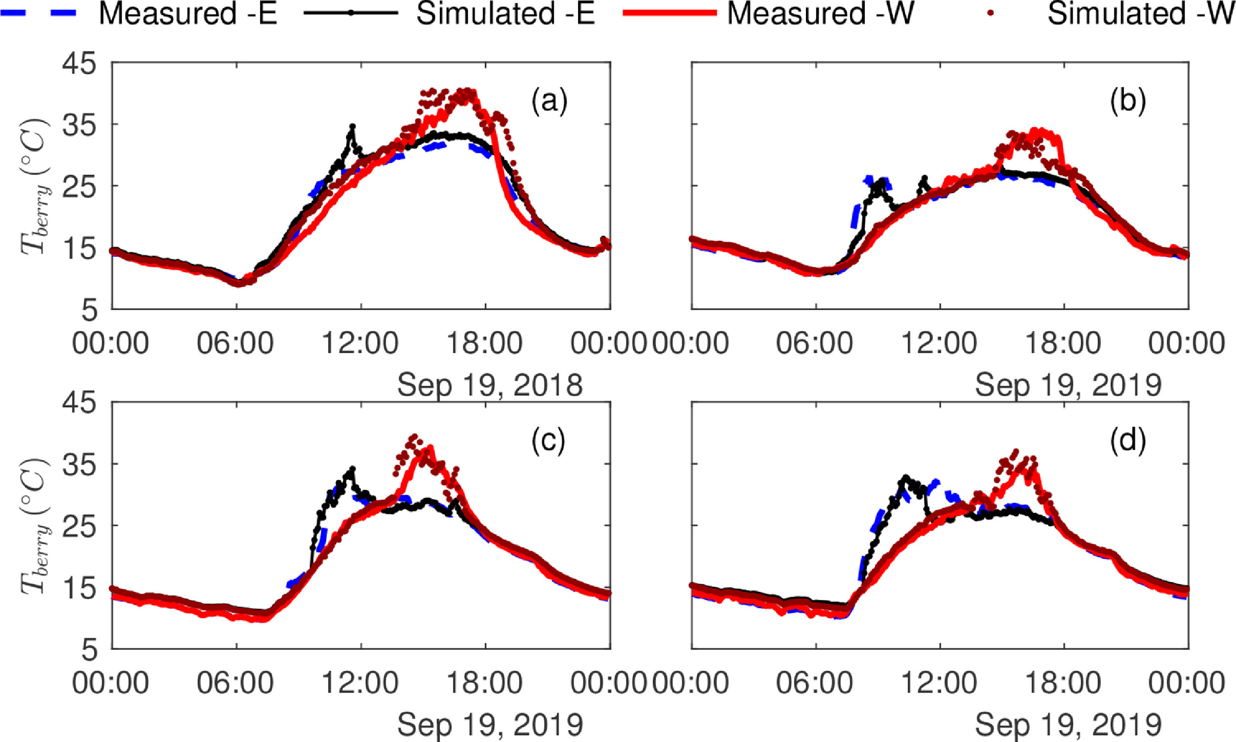 Figure. Daily course of simulated and average measured grape berry temperature in the east and west side of the vine for trellis systems (a) VSP, (b) Wye, (c) Goblet and (d) Unilateral.