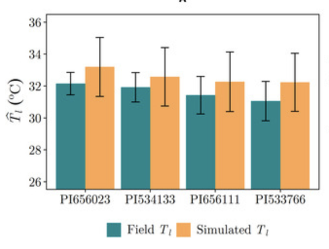 Figure. Measured and simulated cowpea leaf temperature (Tleaf, degrees C) for four different cowpea genotypes.