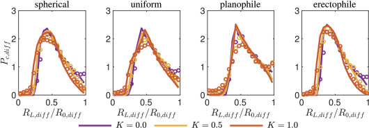 Figure. Probability density function of absorbed diffuse radiation flux within a horizontally homogeneous canopy of \(LAI = 1\). The absorbed diffuse radiation flux, \(R_{L,diff}\), is normalized by the incoming diffuse radiation flux on a surface perpendicular to the sun direction, \(R_{0,diff}\). Azimuthally isotropic leaf angle distributions of spherical, uniform, planophile, and erectophile are shown in each pane as indicated by the title. Each line corresponds to a different angular distribution of incoming diffuse radiation. Open symbols correspond to the distribution obtained from 3D simulation. In all cases shown, the solar zenith angle was 0 (vertical).