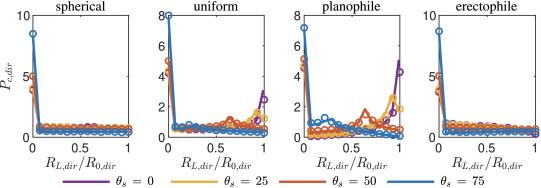 Figure. Probability density function of absorbed direct radiation flux within a horizontally homogeneous canopy of \(LAI = 1\). The absorbed direct radiation flux, \(R_{L,dir}\), is normalized by the incoming direct radiation flux on a surface perpendicular to the sun direction, \(R_{0,dir}\). Azimuthally isotropic leaf angle distributions of spherical, uniform, planophile, and erectophile are shown in each pane as indicated by the title. Each line corresponds to a different solar zenith angle. Open symbols correspond to the distribution obtained from 3D simulation.