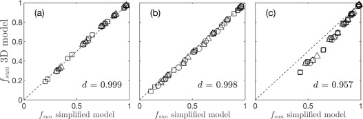 Figure. Comparison of theoretical model for \(f_{sun}\) and the value computed by the 3D model for four different single, isolated crown shapes: (a) spherical crown, (b) ellipsoidal crown, and (c) conical crown. Three different leaf angle distributions were simulated (spherical \(\circ\), planophile \(\triangle\), and erectophile \(\square\)). The dotted diagonal line corresponds to perfect 1:1 agreement.
