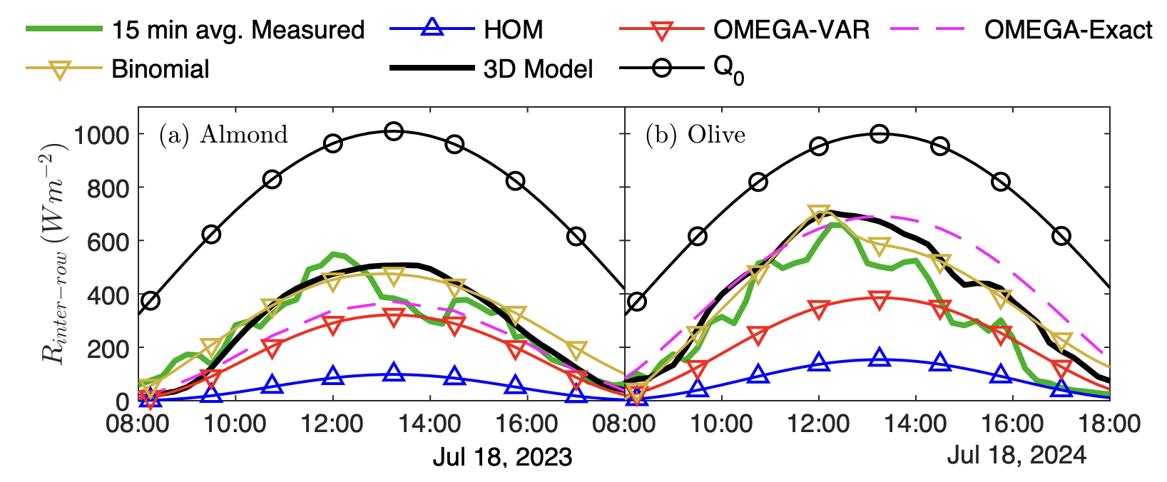 Figure. Measured and simulated 15-minute radiation flux reaching the inter-row in the PAR and NIR band ( \(R_{inter-row}\), W m-2) in an (a) almond orchard with rows orientated: NE-SW at Solano, CA on July 18, 2023 and in an (b) olive orchard with rows oriented N-S at Glenn, CA on July 18, 2024.