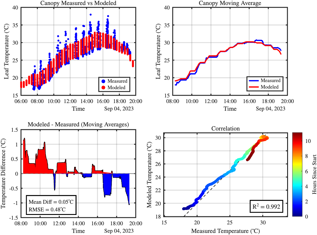 Figure. Comparison between simulated leaf temperature and an ensemble of measurements using a LICOR LI-600 porometer across a day.
