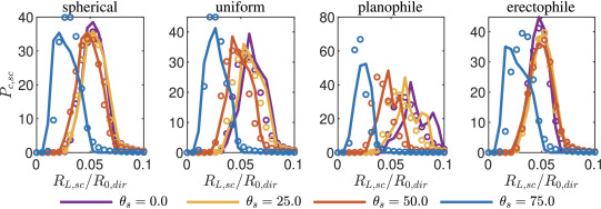 Figure. Probability density function of absorbed scattered radiation flux within a horizontally homogeneous canopy of \(LAI = 1\). Azimuthally isotropic leaf angle distributions of spherical, uniform, planophile, and erectophile are shown in each pane as indicated by the title. Each line corresponds to a different solar zenith angle. Open symbols correspond to the distribution obtained from 3D simulation. In all cases, the diffuse radiation fraction was \(f_{diff}\).