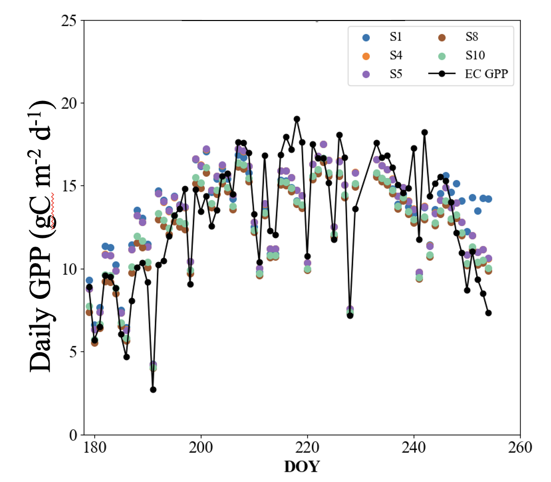 Figure. Validation of Helios against measurements of GPP collected from an eddy covariance tower above a soybean field across time. Different simulation lines correspond to a different scheme for representing spatial heterogeneity in photosynthesis parameters (see Wang et al. (2026) for details).