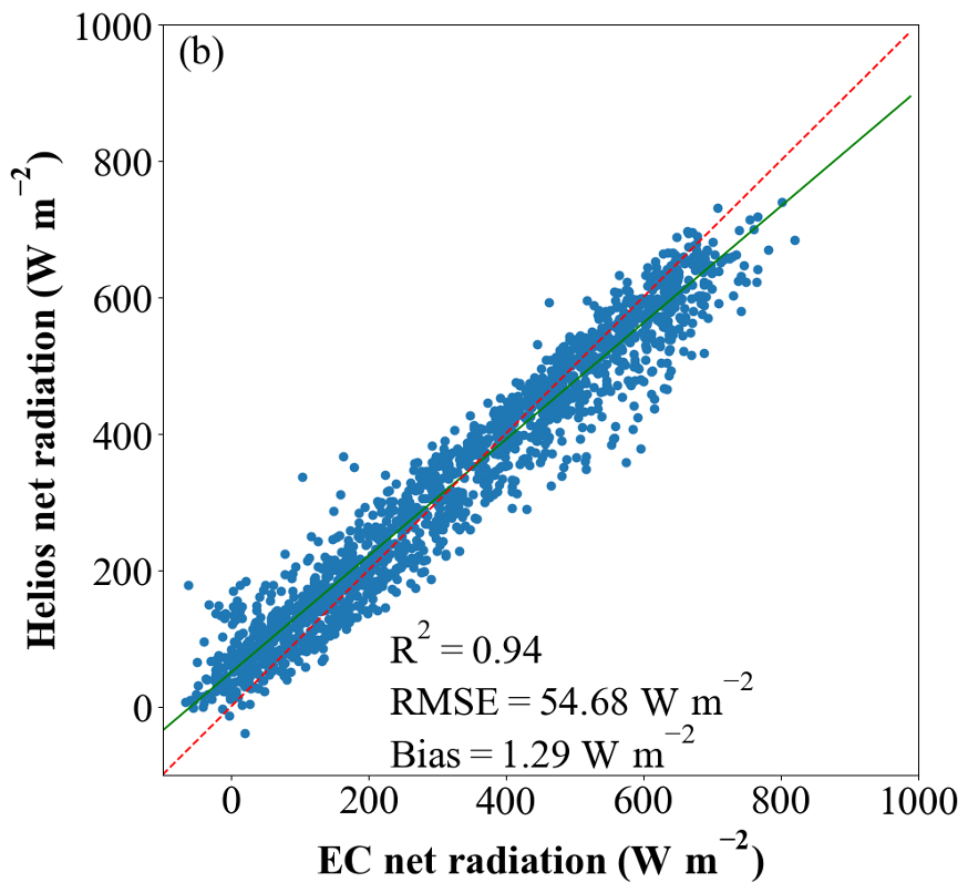 Wang et al. (2026) measured and validated net radiation based on measurements above a soybean canopy across a season. The model prediction agreed well with the measurements, with an overall R2 of 0.94.