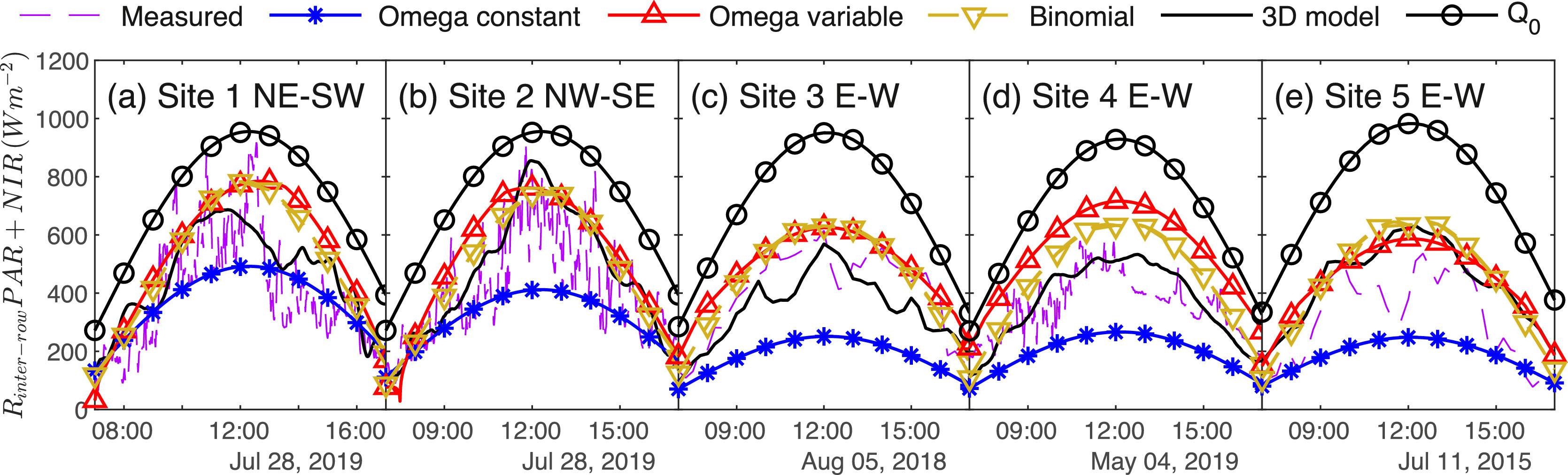 Figure. Measured and simulated radiation flux reaching the inter-row in the PAR and NIR band ( \(R_{inter-row}\)) in five different vineyard designs. This includes split grape canopy cases with rows orientated NE-SW (Site 1) and NW-SE (Site 2) at Barrelli Creek, Cloverdale CA; a double vertical grape canopy case with rows oriented E-W (Site 3) and a split canopy case with rows oriented E-W (Site 4) at Madera, CA; and a split grape canopy with rows oriented E-W in Lodi, CA (Site 5). Measurements and simulations were conducted every 1 min (Sites 1, 2, and 4) and every 15 min (Sites 3 and 5). The dashed magenta line is the measurement, and the solid black like is the Helios simulation. \(Q_0\) indicates the incoming radiation flux.