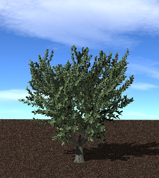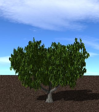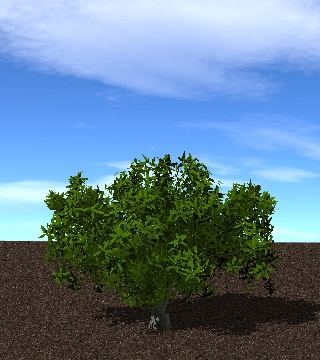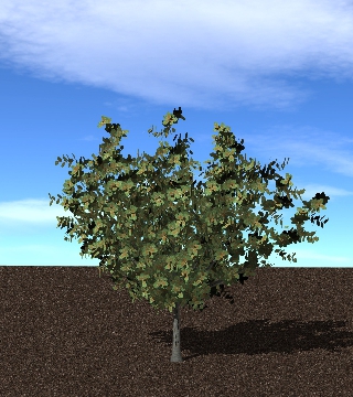 The WeberPennTree member function buildTree() is used to add and instance of a tree from the library. This function takes two required arguments in addition to one optional argument. The user must specify 1) the label for the tree as defined in the tree library XML file (see above), and 2) the (x,y,z) position to place the tree (note that this position is with respect to the base of the trunk). A third optional argument specifies a scaling factor to apply to the tree, where scale<1 makes the tree smaller, and scale>1 makes the tree bigger. The buildTree() function returns a uint that gives an identifier for the particular instance of the tree. This can be used later to reference the tree.