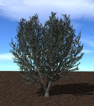 The trunk radius at the base is given as a fraction (Ratio) of the total height of the tree. For example, Ratio = 0.05 gives a trunk radius that is 5% of the total height of the tree. The trunk radius can taper along its lenght according to the parameter ‘0Taper’, with 0<=0Taper<=1. 0Taper=0 gives no tapering, and 0Taper=1 tapers the trunk to a point (i.e., radius=0).