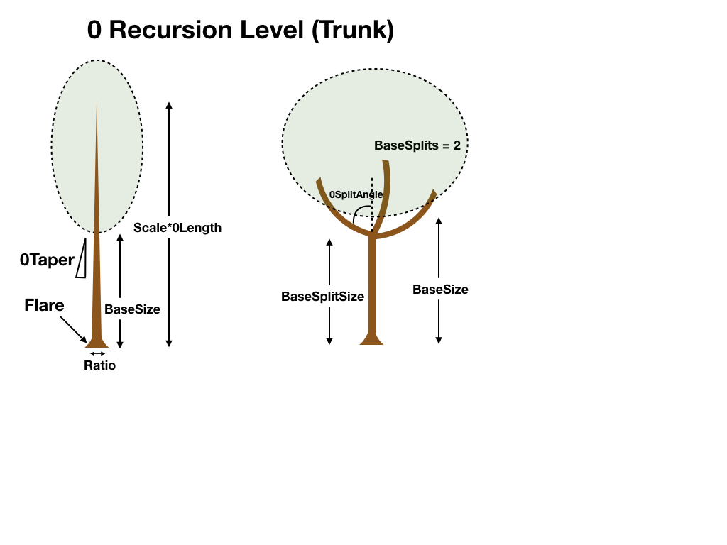 | 0Length | Length of the tree trunk as a fraction of scale. Usually, 0Length is set to 1 (i.e., 100%). |