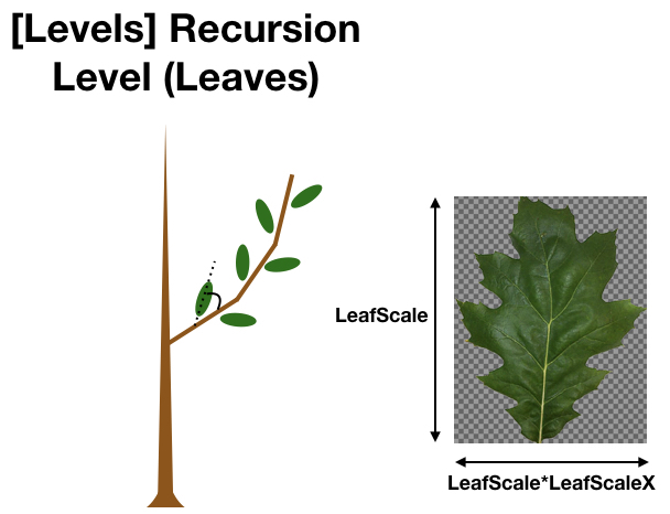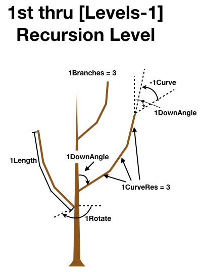 Many parameter names are prepended with the letter "n", which indicates that these parameters vary with recursion level. For example, the parameter Scale is a scaling factor applied to the whole tree, and thus it does not depend on the recursion level. The parameter nBraches gives the maximum number of branches for each recursion level (note the "n" in the name), and therefore can have a different value for each recursion level. Below, each recursion level will be referred to by replacing "n" by the level number (e.g., 0Branches, 1Branches, 2Branches, etc.).